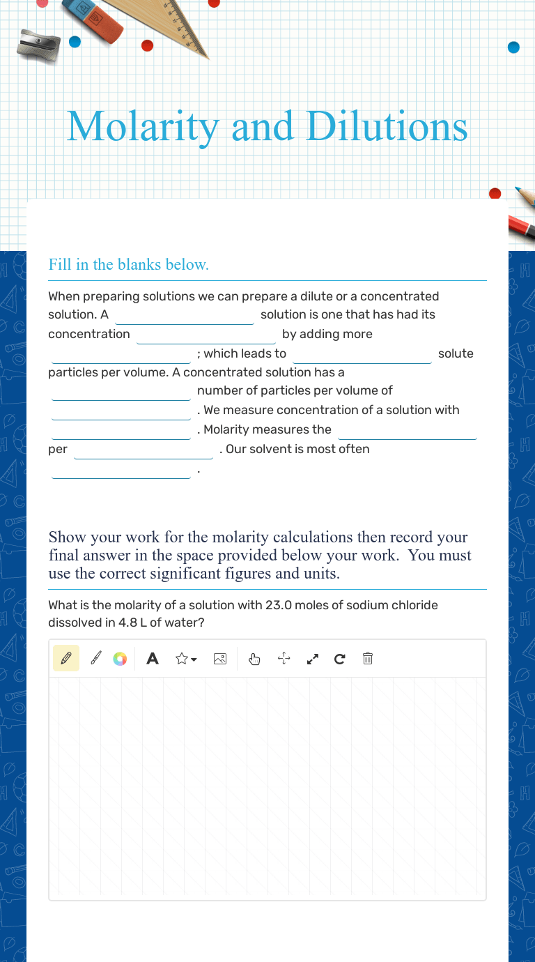 Assuming the density of the solution is 1.0 g/cm3, calculate the molarity and molality of h2o2. Remember that you can change the concentration of a solution by adding more solvent. 1.0 moles of potassium fluoride is dissolved to make 0.10 l of solution. 100ml=1l 58.44/1mol 29.25gx1mol/58.44=0.5005mol 0.5005/2.0= 0.25 . Where m = molarity and v = volume. Calculate the molarity of 0.289 moles of fecl3 dissolved in 120 ml of solution? Solubility curve practice problems worksheet 1. Concentration of lons in solution. The preparation of solutions by dilution. What is the molarity of a solution made by dissolving 3.00 moles of nacl in enough. Calculate how many grams of chemical would be required to prepare the . What is the molarity of a solution in which 58 g of nacl are dissolved in 1.0 l of solution? What is the molarity of a solution made when 52 grams of potassium sulfate are diluted to a volume of 4100 ml?